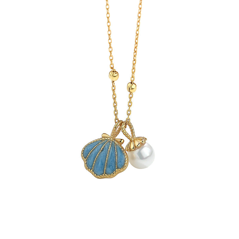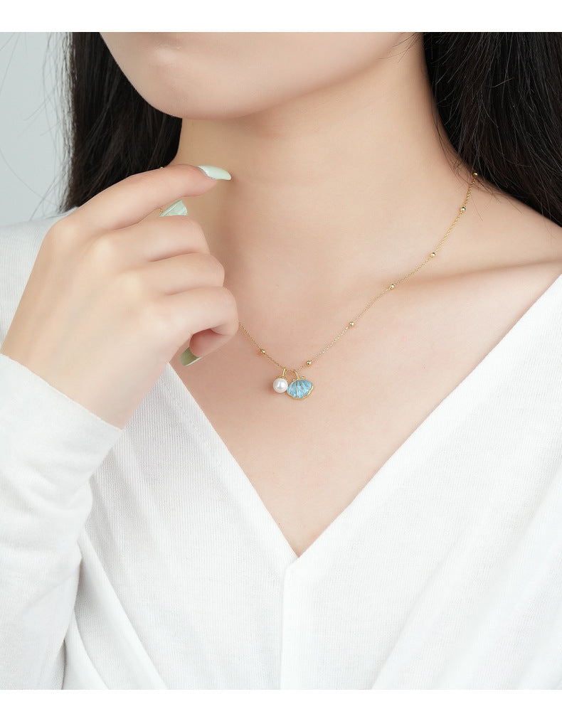 • Collier fin en plaqué or 18K, orné d’un pendentif coquillage bleu nacré et d’une perle blanche délicate.