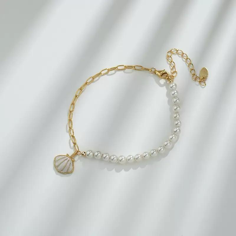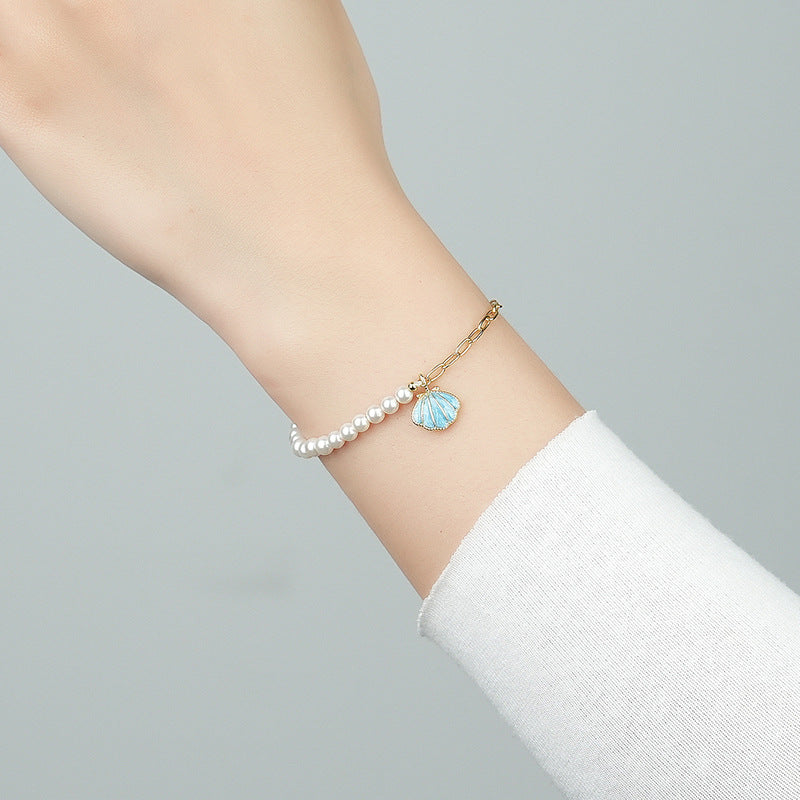 • Bracelet raffiné, alternant perles blanches lumineuses et pendentif coquillage bleu doré.