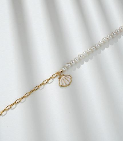 • Un bracelet assorti, alternant perles blanches et pendentif coquillage doré pour un look raffiné.