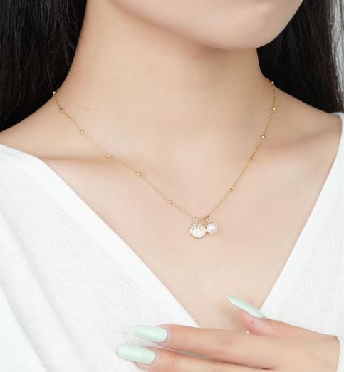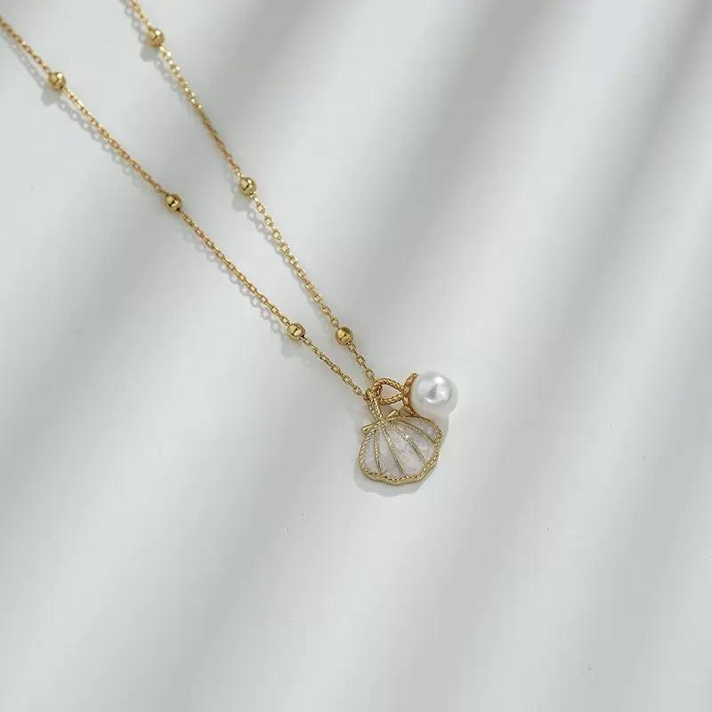 • Un collier fin en plaqué or 18K, orné d’un pendentif coquillage nacré et d’une perle blanche lumineuse.
